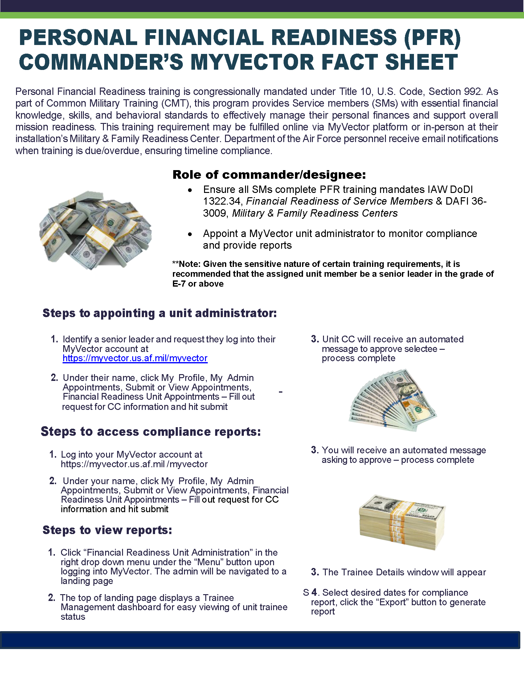 The National Defense Authorization Act (NDAA) of 2016 stipulated a significant number of changes to 10 USC §992 which effectively created 12 mandatory touchpoints where a service member must receive financial literacy training. The change in law required service members to possess the knowledge and skills to make informed and effective decisions at various life stages.