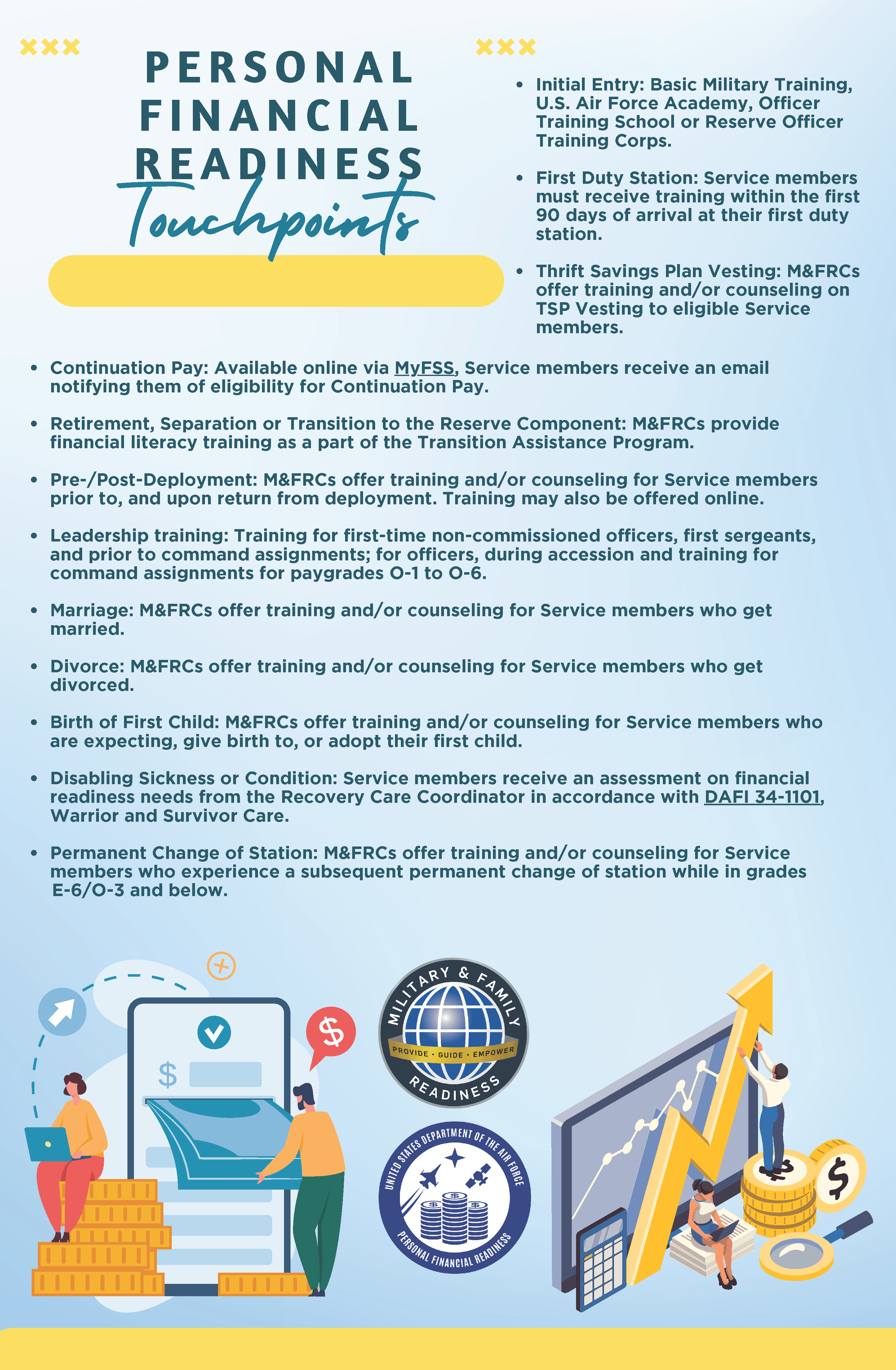 The goal of the Personal Financial Readiness Program is to help Airmen, Guardians, and family members by providing foundations at the beginning of their career and developing across the continuum to improve financial literacy.